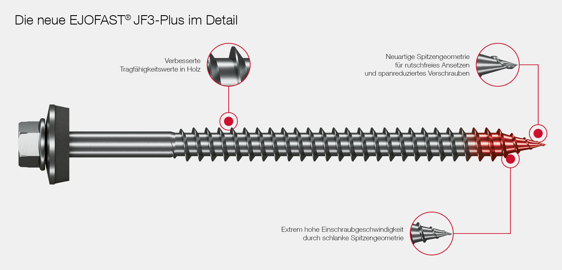 Die optimierte und einzigartige Spitzengeometrie der neuen EJOFAST® Plus Bohrschrauben ermöglicht, durch die noch feiner ausgeformte Spitze, ein deutlich sichereres Ansetzen auf der Oberfläche. Ein Tänzeln oder Abrutschen ist nahezu ausgeschlossen. Gleichzeitig wurden die Tragfähigkeitswerte nochmals verbessert.