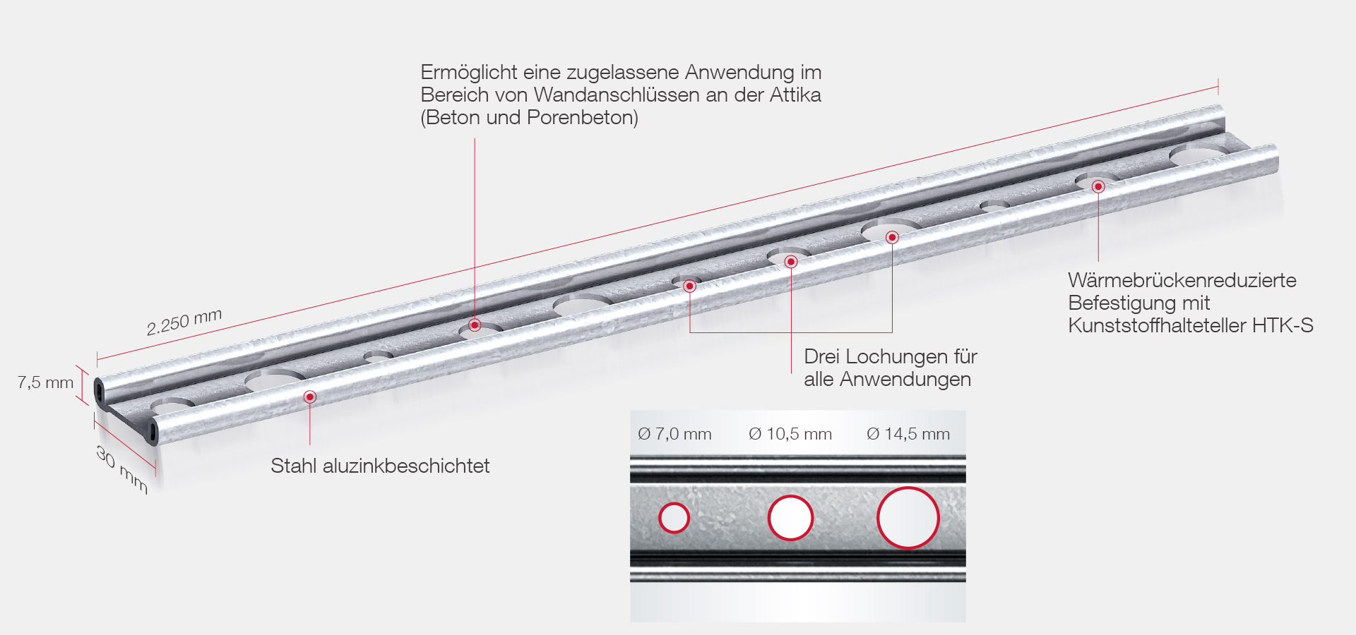 Mit dem neuen Linienbefestigungssystem zur mechanischen Sicherung von Dachbahnen können nahezu alle Anwendungsfälle abgedeckt werden. Das biegesteife Metallprofil mit einer Aluzinkbeschichtung verfügt über drei unterschiedliche Lochdurchmesser. Dadurch ergeben sich viele Verarbeitungsmöglichkeiten mit Dachbohrschrauben, klassischen Bohrschrauben, Rahmendübeln und zum Teil auch in Kombination mit einem speziellen Kunststoffhalteteller zur Reduzierung von Wärmebrücken. Das EJOT Linienbefestigungssystem bietet als einziges Flachdachprofil eine zugelassene Lösung für alle Anwendungsfälle im Flachdach nach ETA-07/0013 und der aufsteigenden Wand nach ETA-10/0305.