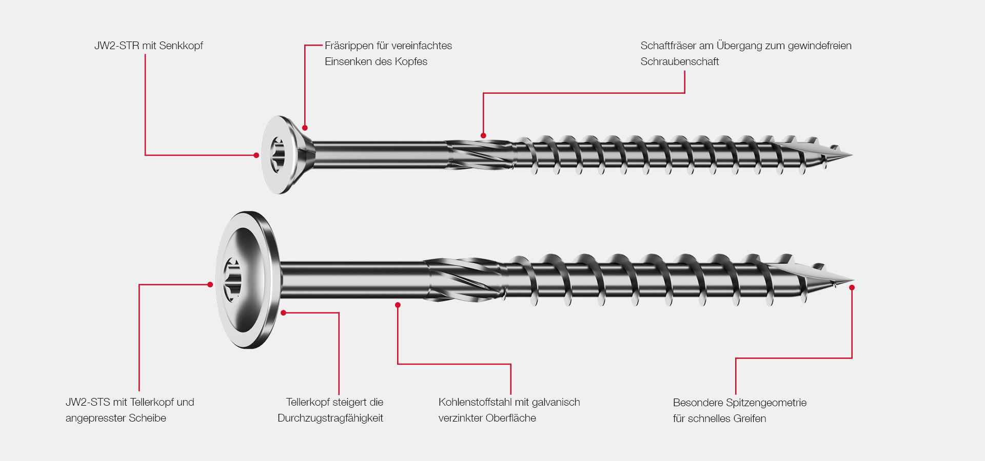 - T-FAST® JW2-STS Tellerkopfschraube mit angepresster Scheibe. Der Tellerkopf ermöglicht ein starkes Zusammenziehen und steigert die Kopfdurchzugstragfähigkeit